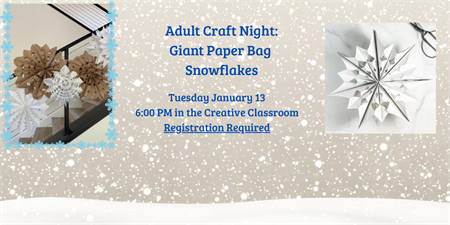 Registration is required. https://calendar.csmpl.org/event/adult-craft-night-giant-paper-bag-snowflakes-12164
